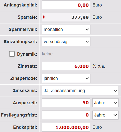 Um das Meiste aus Ihrem Geld rauszuholen und folglich die monatliche Sparrate so gering wie möglich zu halten, ist logischerweise eine hohe Rendite notwendig. Wenn wir eine durchschnittliche Rendite in Höhe von 6% p.a. unterstellen, sind für 1 Million in 50 Jahren – ohne Berücksichtigung von Steuern – nur 278€ mtl. Sparrate nötig. Abzüglich Kindergeld von aktuell ca. 260€ sind das nur unter 20€ Eigenanteil. Und das ist m.E. für jeden machbar – übrigens auch für das Kind, wenn es erwachsen ist, sein eigenes Geld verdient und die volle monatliche Sparrate fortführen sollte. Denn günstiger kann es sich die eigene Altersvorsorge nicht aufbauen.