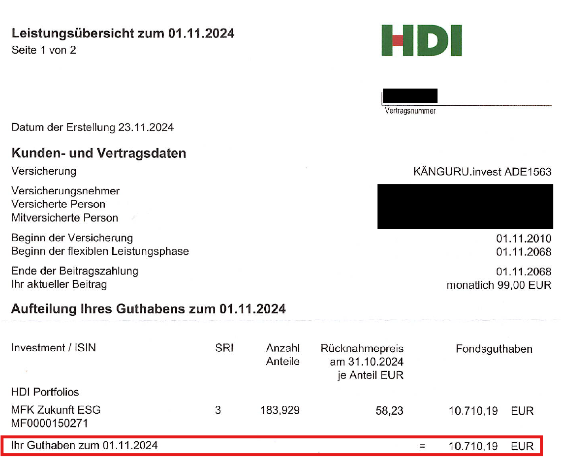Hier mal ein Praxisbeispiel. Kunden von mir haben vor etwa 15 Jahren eine Kinderpolice für ihren Sohn abgeschlossen. In dieser Zeit haben sie 11.759€ eingezahlt. Das aktuelle Vertragsguthaben beträgt jedoch nur 10.710€ , also 1.049€ weniger. Dies entspricht übrigens einer Rendite von minus 1,5% p.a. Das ist übrigens kein Einzelfall, sondern die Regel!