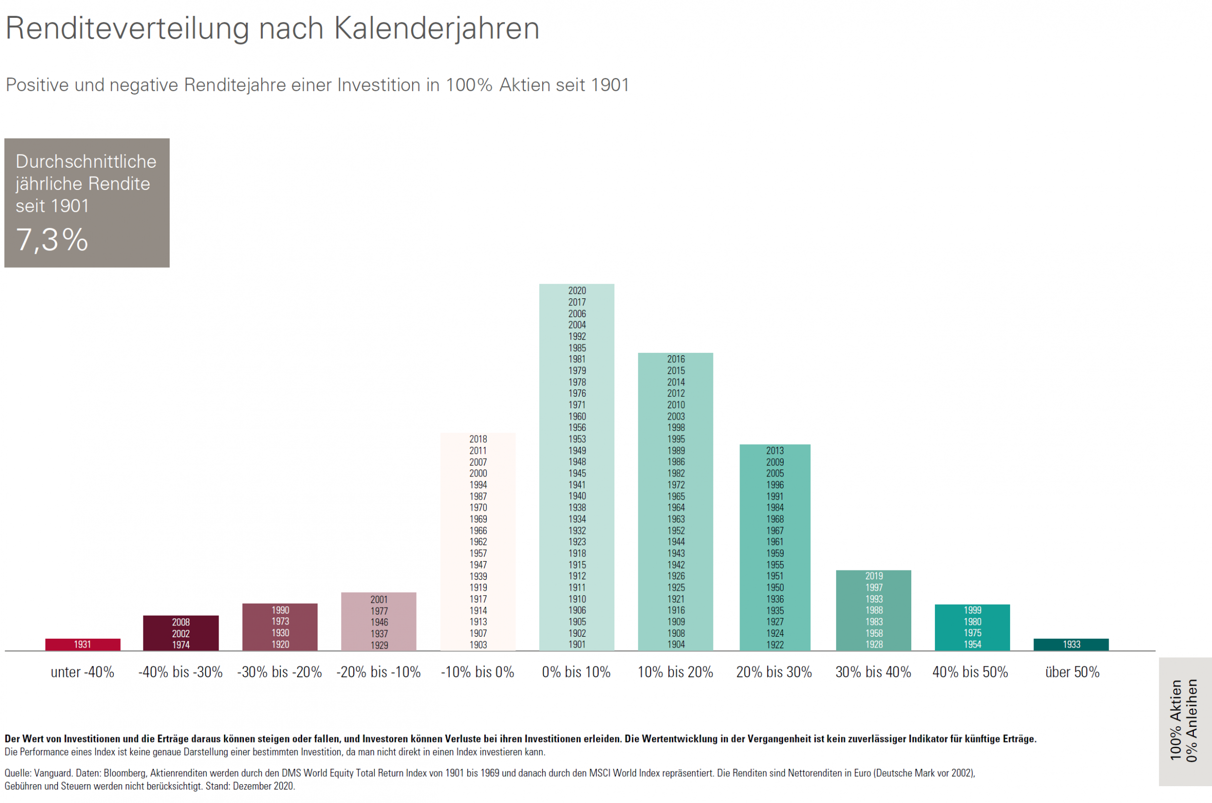 Ja, aber sind 6% p.a. nicht ein bisschen weit hergeholt? Schauen Sie, ein global diversifiziertes Aktienportfolio hat in den letzten über 100 Jahren im Durchschnitt über 7% p.a. erzielt. Und wenn Sie min. 15 Jahre durchgehend investiert waren, konnten Sie auch keine Verluste machen.