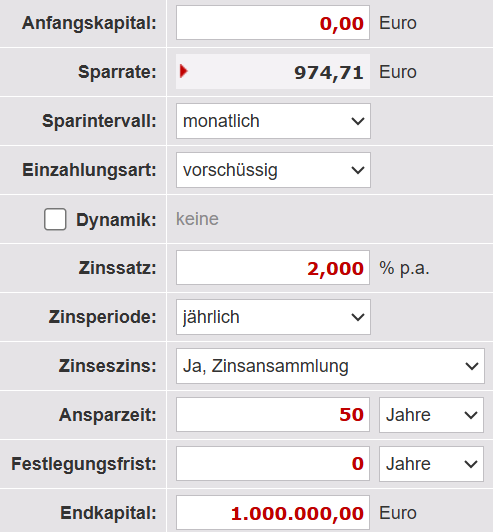 Auf einem Sparbuch bzw. Tagesgeldkonto bekommen Sie nur sehr geringe Zinsen. Beim Tagesgeld sind das aktuell um die 2% p.a. Damit Ihr Kind bzw. Enkelkind zum 50. Lebensjahr 1 Million auf dem Konto hat, müssten Sie also – ohne Berücksichtigung von Steuern – jeden Monat rund 975€ sparen. Abzgl. Kindergeld von aktuell ca. 260€ sind das immer noch 715€ im Monat Eigenanteil, was für die meisten eher schwer realisierbar sein sollte.